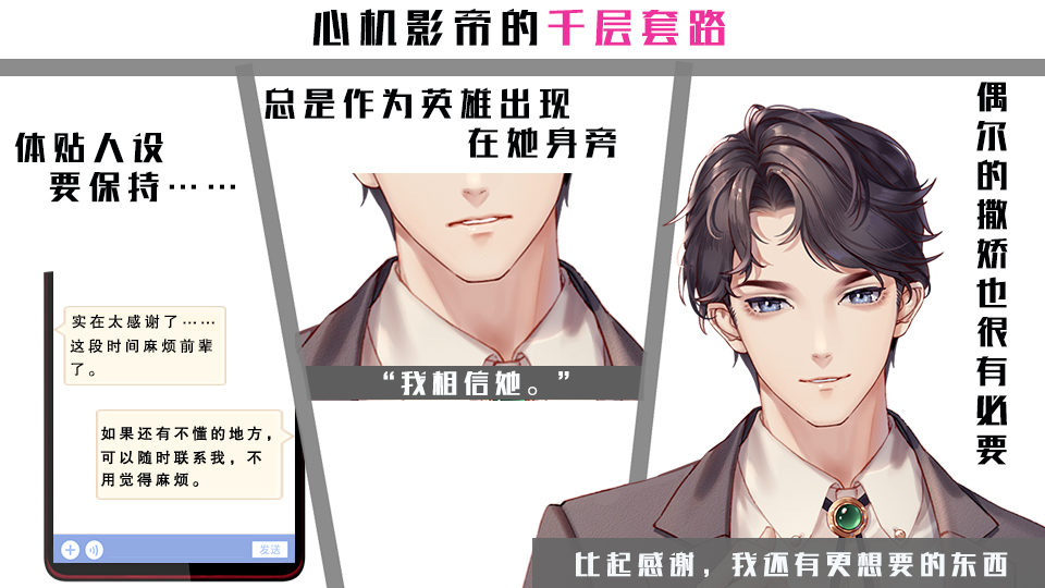 依旧拿咱们上期的娱乐圈题材举例,假如安排主角可攻略人物之一是温和优雅的当红影帝,但这个人设在娱乐圈题材中并不罕见,我们要写得出彩,可以在这个基础上,可以再加一些特质,比如虽然影帝表面温和优雅,但其实是一个占有欲特别强的心机boy,帮了主角但一定会暗搓搓的提醒主角是他帮的,在主角向别人请教演技时,会略感失望的询问为何不找他。