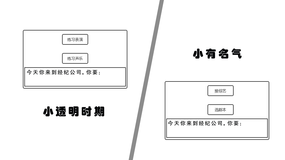 等主角有了一定实力和知名度后,去经纪公司除了排练,还可以挑选剧本和接综艺,触发此类相关的剧情。
