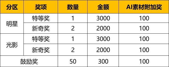 (注:AI素材附加奖——若获奖作品中大量使用了AI素材,则可额外获得获奖名次对应的AI素材附加奖。)