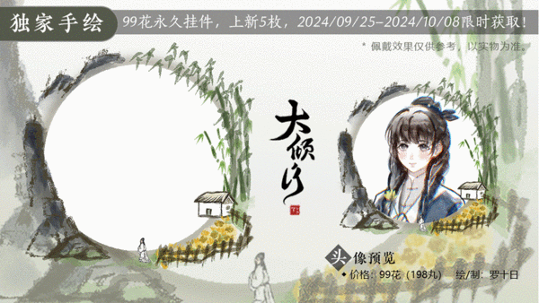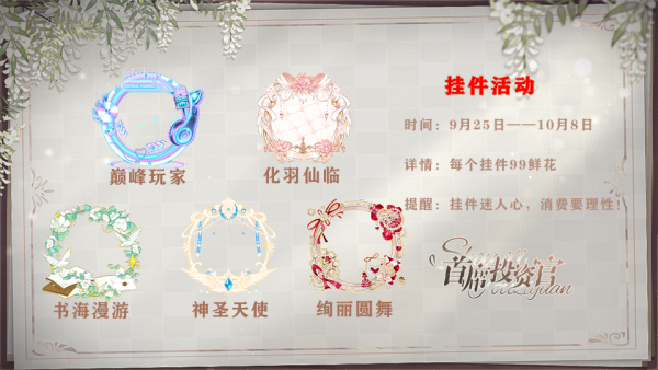 1.自2024年10月1日00:00——2024年10月7日24:00为止,凡是给本刊中出现的任意一款国庆自运营活动作品,送花满100(投入卡集的花不计入),可获得【国庆挂件(60天)】一个;