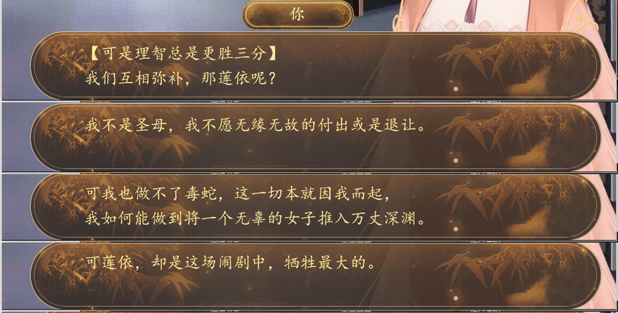 故事结尾虽然是好的,但是通篇下来只有一个反派角色,且自始至终女主都没有因为女配的刁难而有所成长,最终也是因为毕业与女配各奔东西,才能走到好的结局,这样的故事主角会让玩家感觉到憋屈,丝毫没有体验感。