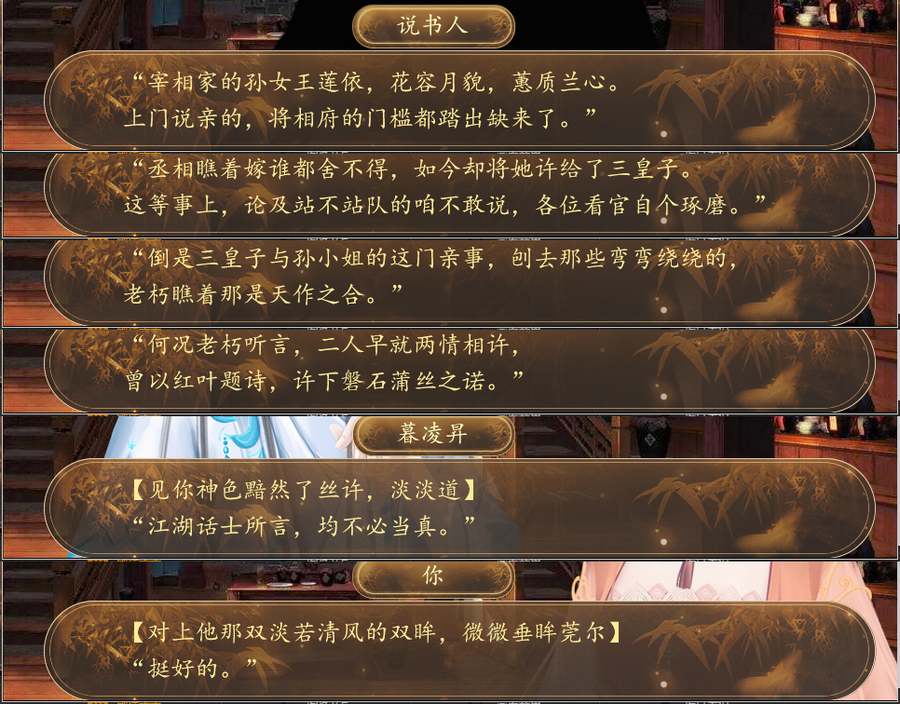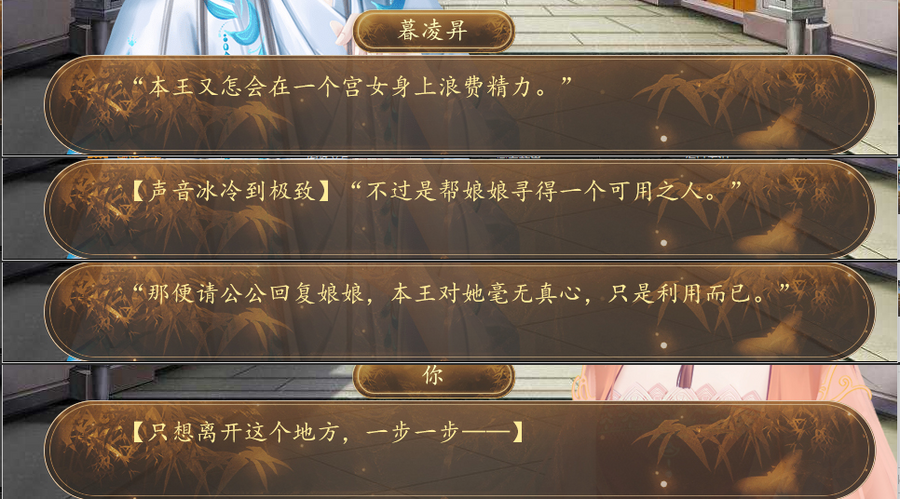 以下案例出自橙光作品《我有灵魂两百斤》中的暮凌珏线。本作讲述女主林绥穿越异世,在不断的成长与历练中,从平民百姓变为四皇子正妃,最后成为一代皇后的故事。