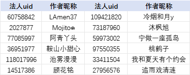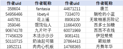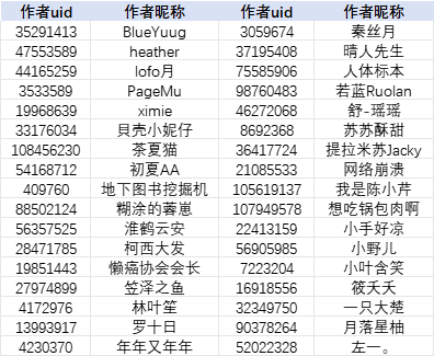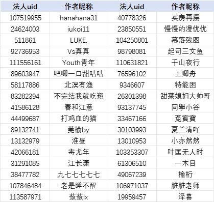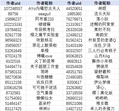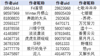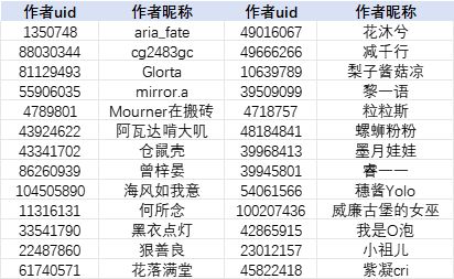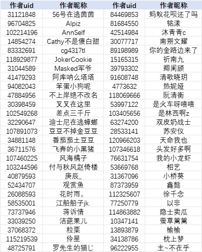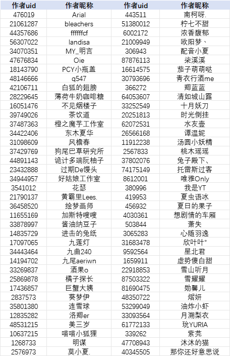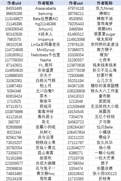注:为方便作者查找,本名单按照作者昵称首字母升序排列