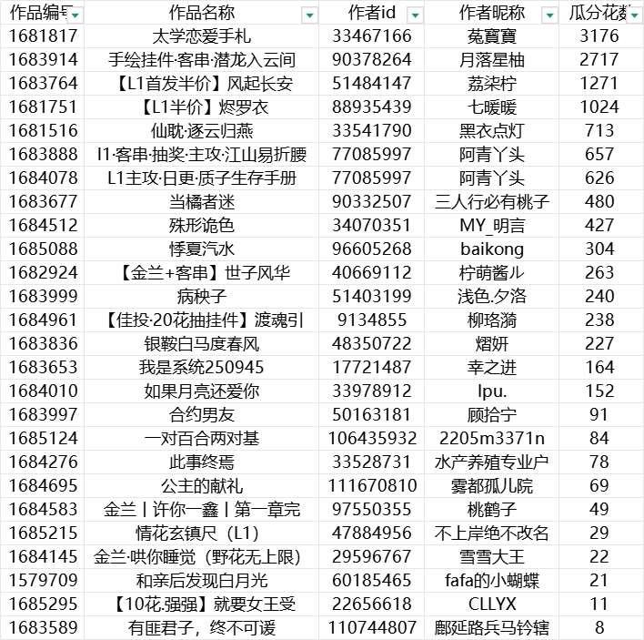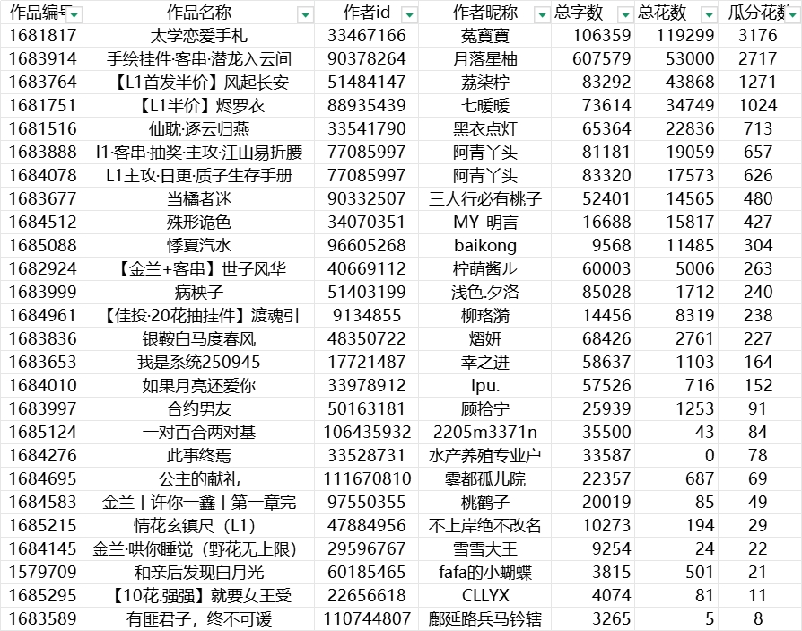 3.作品字数、等级及收花以完结时的作品数据为准。