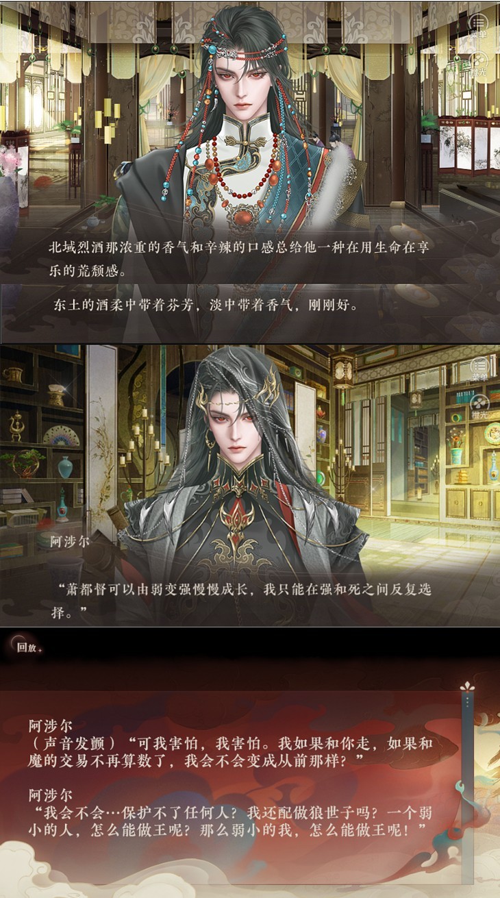 在角色互动上,成年男主和幼年男主都曾在和其他角色对话中直接评价过自己对于世子之责的看法。尽管并不突兀,但这些评价与男主当时和他人讨论的话题关系并不大,所以读者一扫而过,心中只留下一个男主对世子身份貌似不是很能接受,有点小压力的印象。