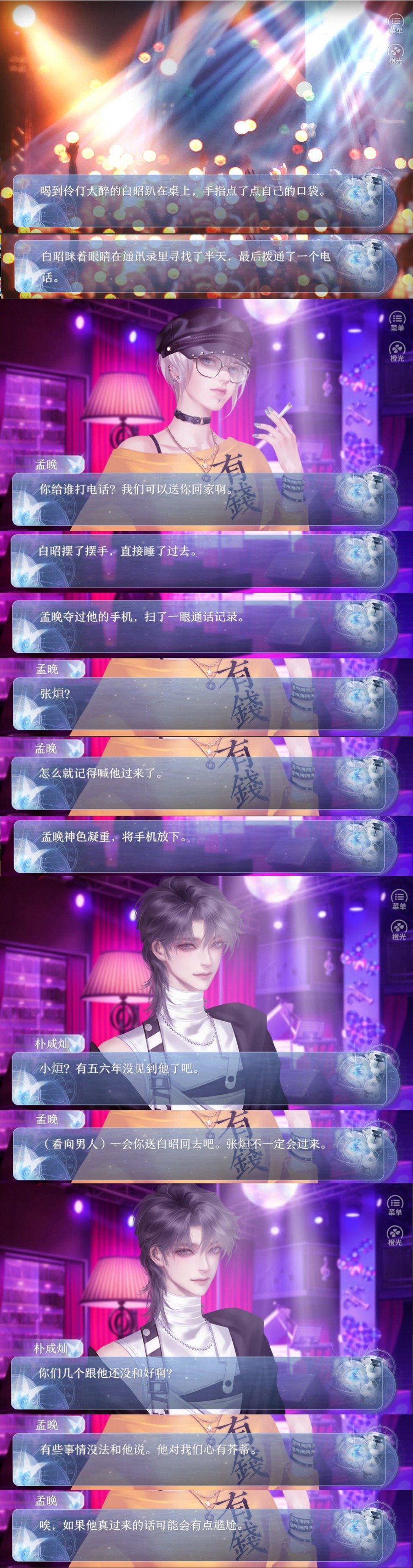 酒吧中,配角因为向歌手告白失败去喝酒,醉酒后拨通了男主的电话要求扶他回家。从其他配角阻拦和对话中,玩家能得知男主和出场几个人之间有(不太愉快的)故事,让人好奇他们之间的关系:为什么几人关系尴尬却还是找他过来帮忙?勾起好奇心让读者继续追,也为后面配角们托主控帮忙带东西做好铺垫。