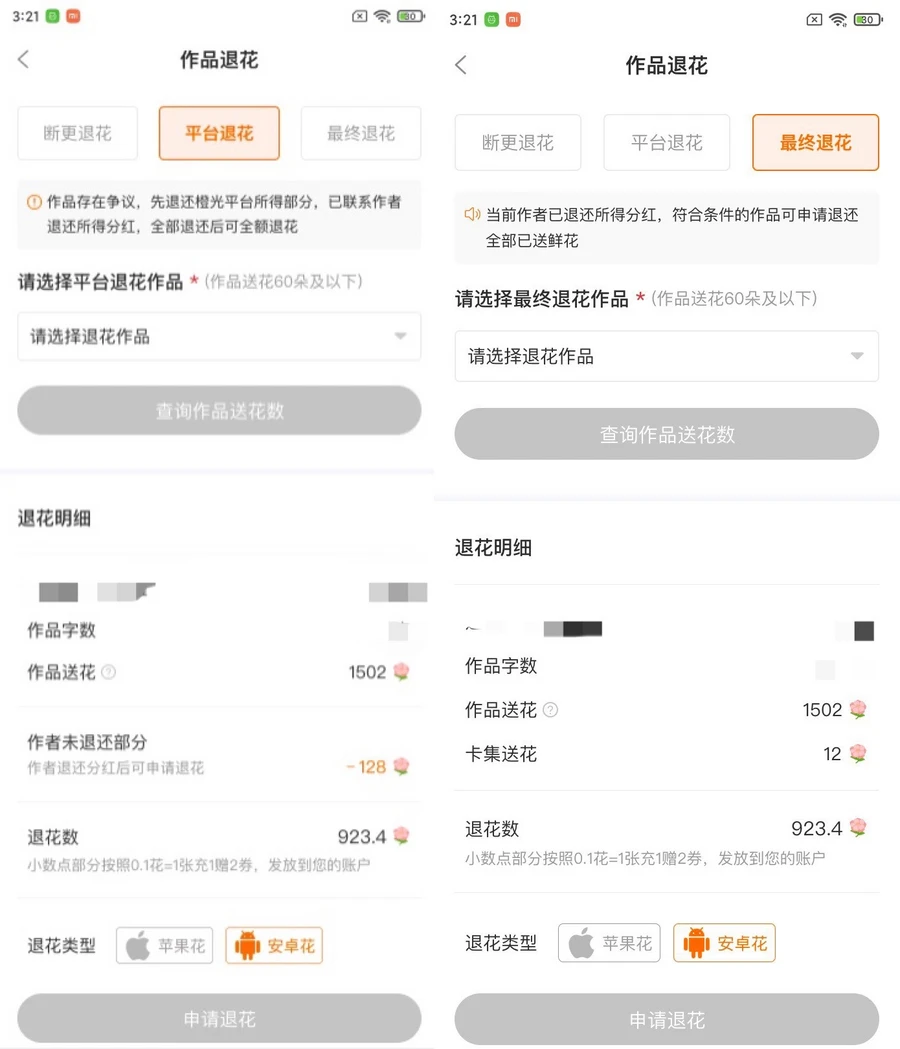 当平台退花的作品作者已退还所得分红后,用户可继续申请最终退花,退还剩余鲜花;或因星动卡收花的作品作者退还除星动卡所得分红后,用户可申请最终退花,退还非星动OS的送花数。