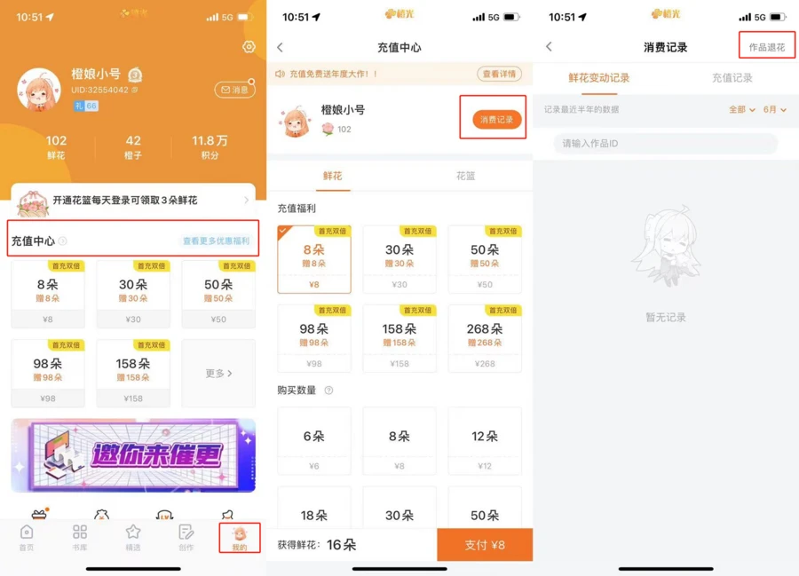 步骤1:【新版橙光APP】-【我的】-【充值中心】-【消费记录】-【作品退花】中,选择【我要退花】选项;