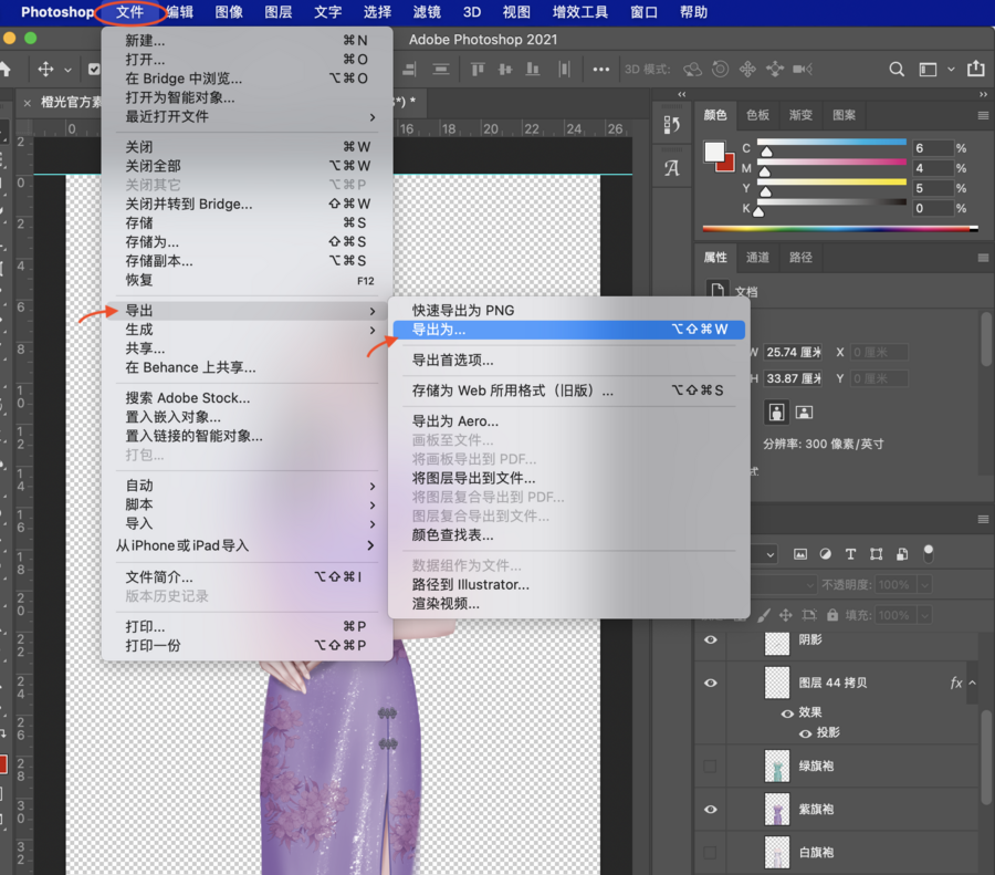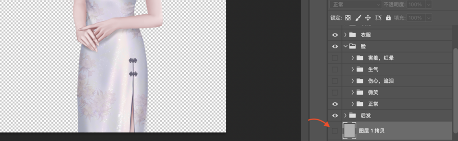 ③变为透明背景后,勾选需要的服装表情等图层(如紫旗袍,微笑),选择“文件”--“导出”--“导出为”