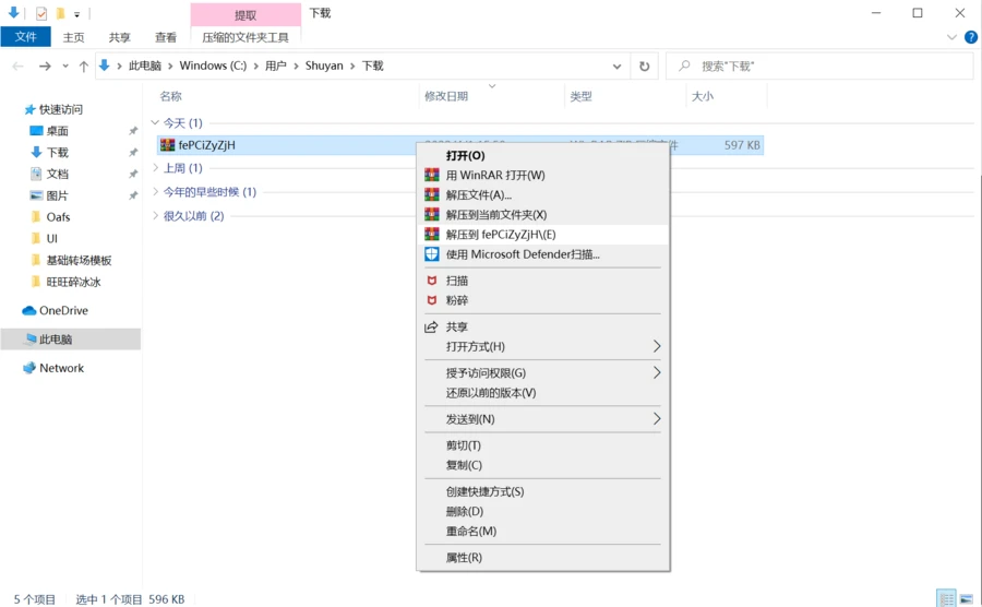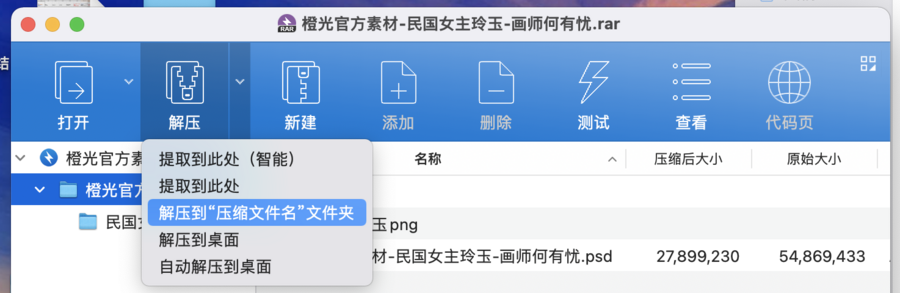 ①右键单击压缩包,选择“解压到xxx(文件名)”,即可的到同名源文件包。