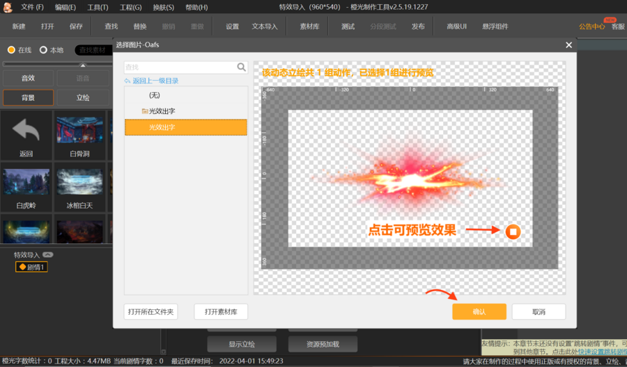 ⑤点击“确认”,设置好特效的显示位置、大小、播放类型等,即插入完成!