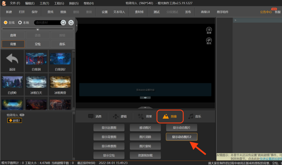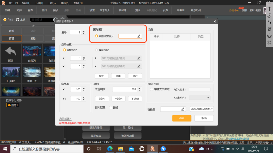 ③点击“图像”--“显示动态图片2”,出现弹窗,点击“使用指定图片”。