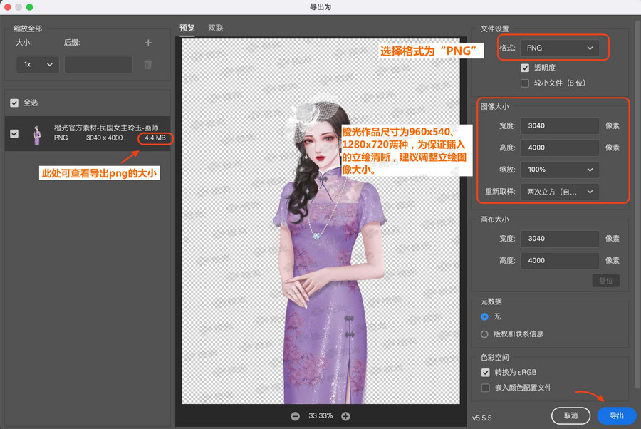 ④在“导出为”界面,设置导出图像的格式(PNG)及图像大小(建议宽度1000像素,可插入作品看清晰度)。设置好后点击“导出”,即可得到后缀为“.png”的立绘文件。