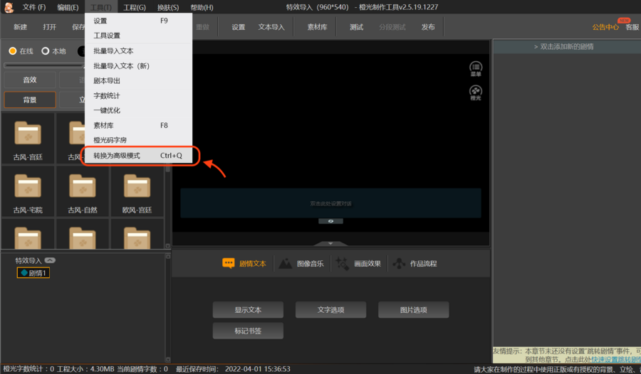 ②打开制作工具,定位在需要添加特效的剧情。按“Ctrl+Q”转换为高级模式。