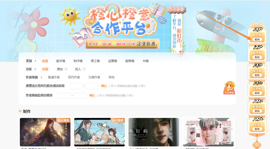 根据需要,我们可以按照【全部】【制作橙】【剧本橙】【美工橙】【运营橙】【配音橙】【AI橙】筛选需要的合作伙伴: