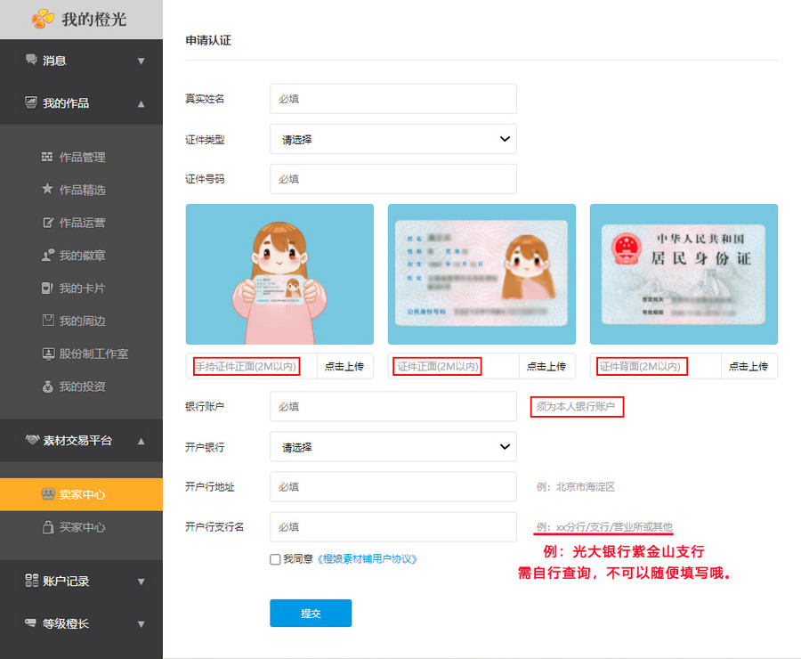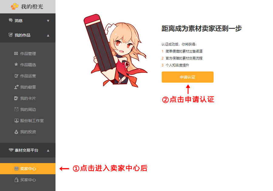 前往PC端橙光官网-个人中心-卖家中心,点击认证上传信息