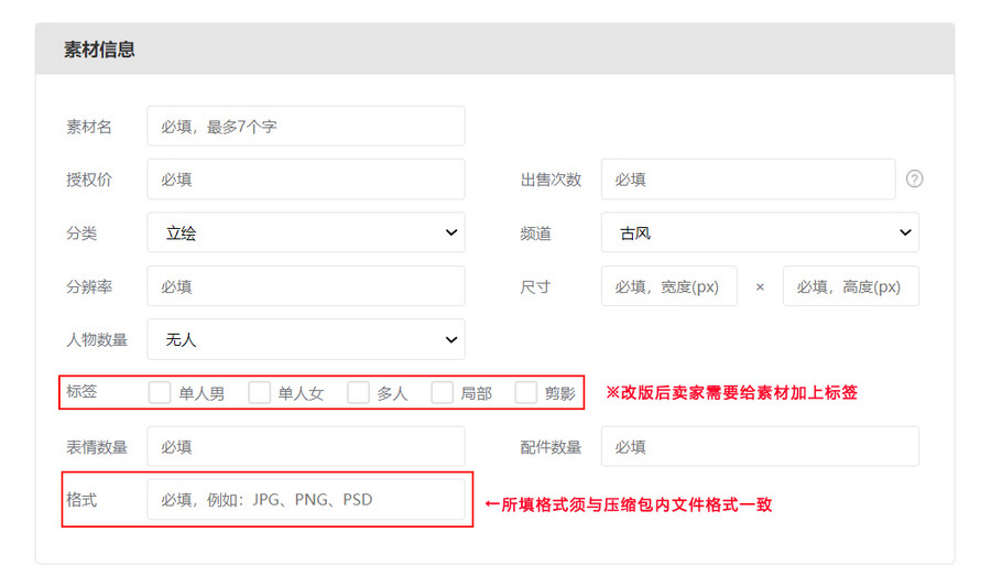 第二步,按照要求和指定格式填写素材信息并上传素材文件