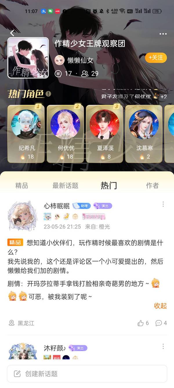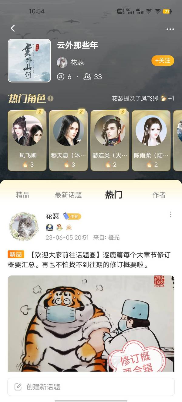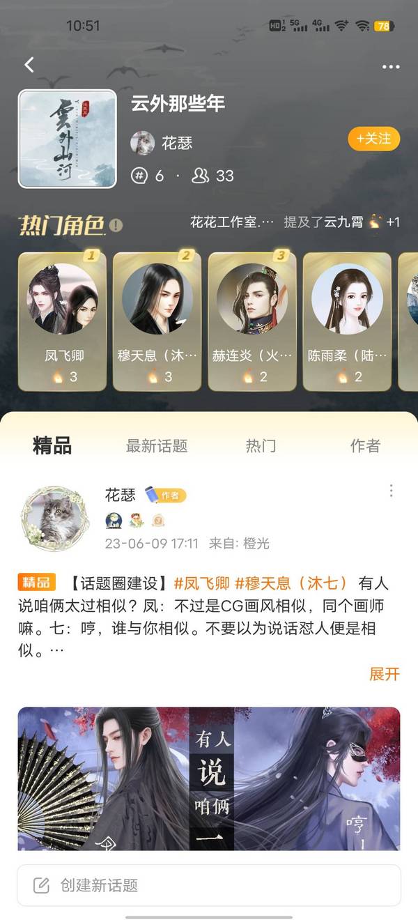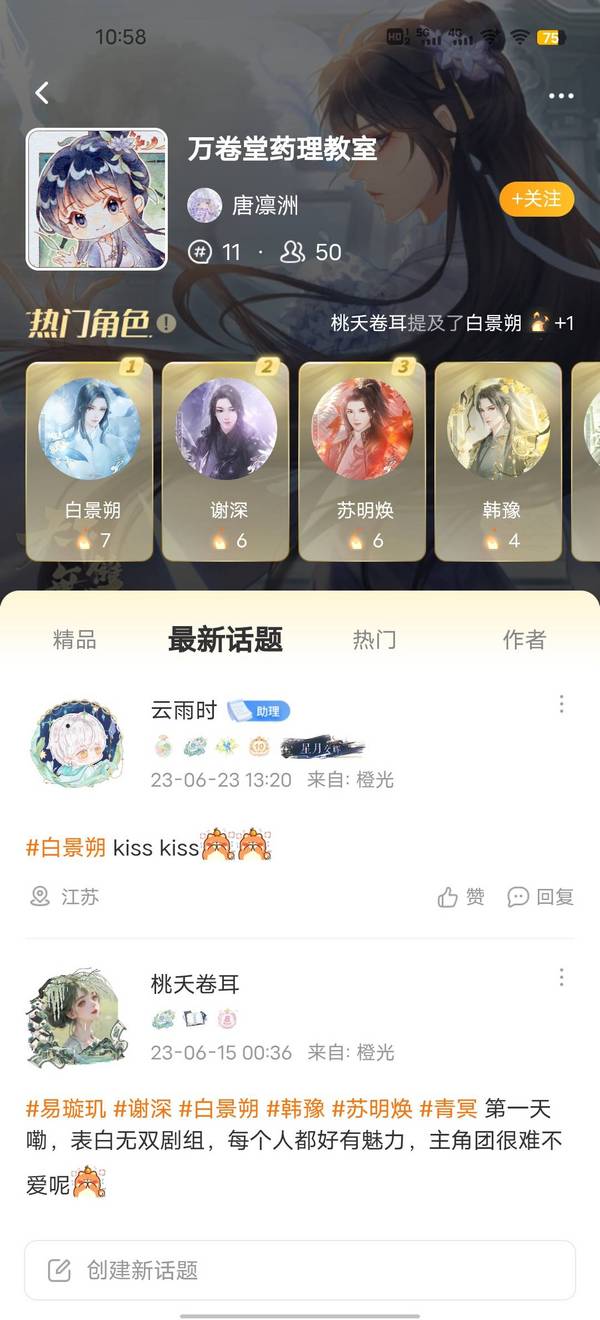 当作者大大通过申请后,小橙子就成功加入了该部作品的话题圈,可以在里面进行发言,诸如发帖表白角色、与其他成员友好交流、催更打call两不误~
