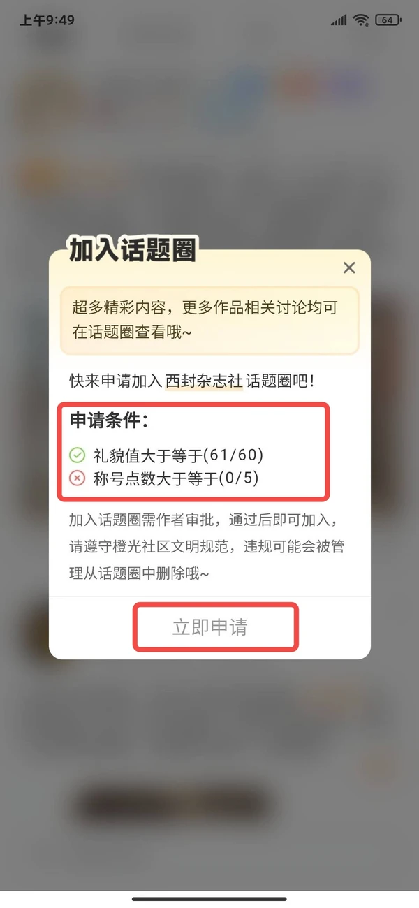 在已开通话题圈的作品详情页中,会显示话题圈入口,点击后出现申请界面。当符合进入话题圈的条件时,就可以点击立即申请,等待作者大大审核通过咯~流程超简单der!