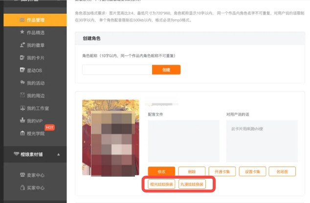 星动os月赛期间,可上传娃娃服装的作品在作者后台点击【橙光娃娃换装】或【丸漫娃娃换装】按钮,点击后可以上传娃娃换装,月赛后(截至每月27号23点)不可上传、修改全部内容,只能查看已上传相关数据。