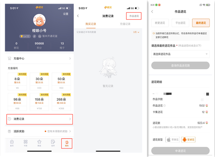 2. 【新版橙光APP】-【我的】-【消费记录】-【作品退花】中,选择【我要退花】选项;