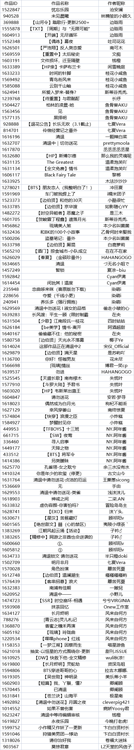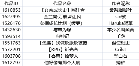 二、以下作品退花将通过后台直接退回。自公告之日起3日内,后台将自动返还鲜花,请关注站内私信通知。