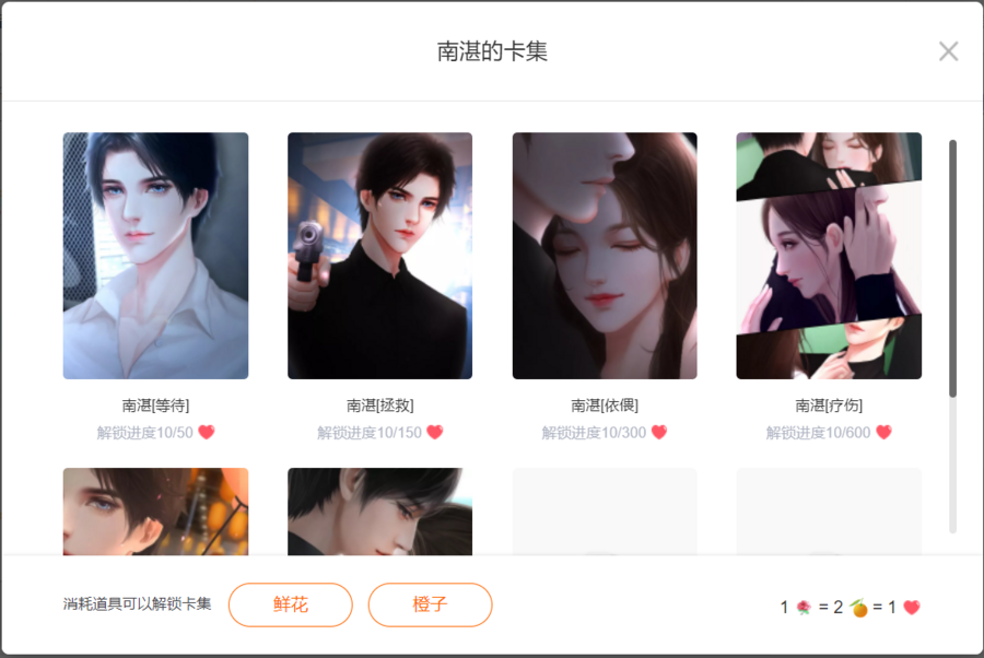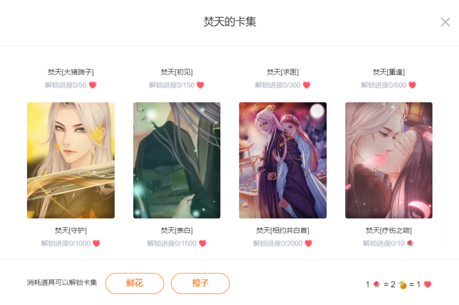 PC端点击卡集标识即可进入查看卡集内的表白卡,通过投喂鲜花或橙子来解锁卡集内的表白卡。