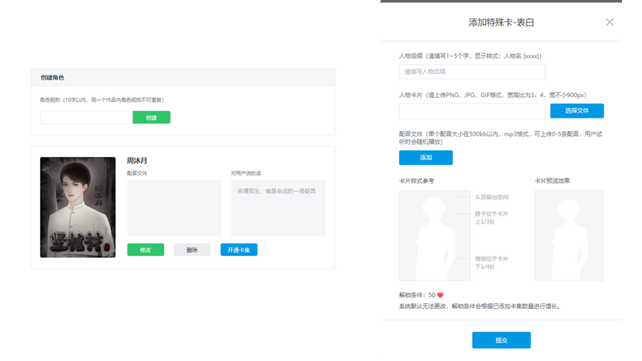 作者如果想给角色开通卡集功能,在作者后台中的【作品管理】-【编辑作品】-【表白墙】-【设置卡集】即可。