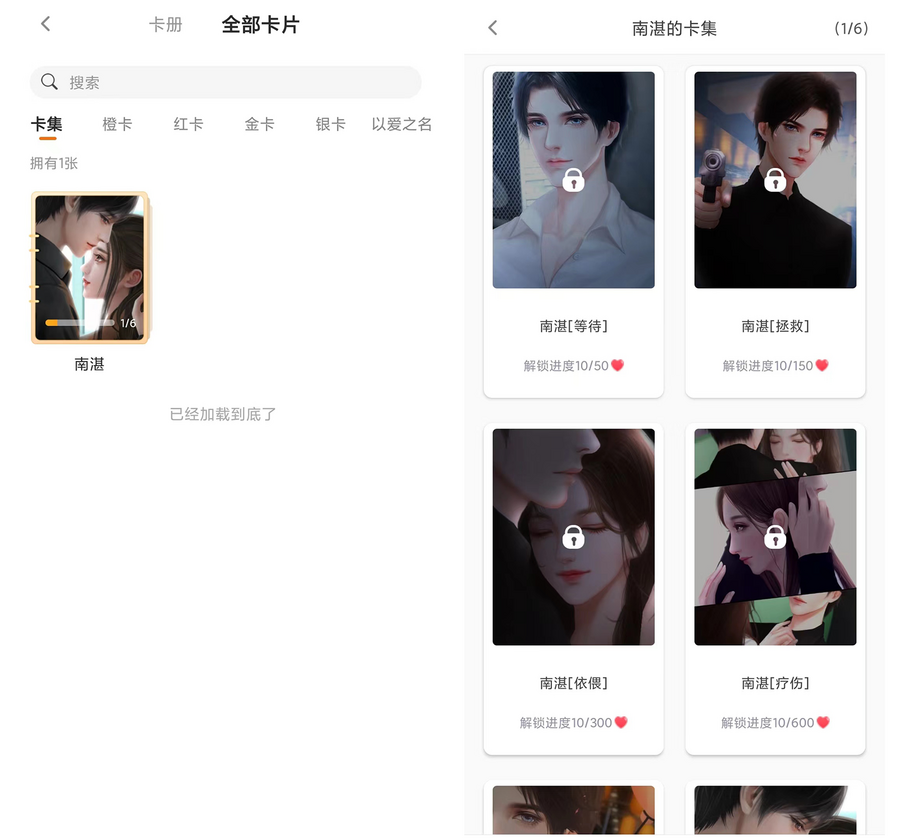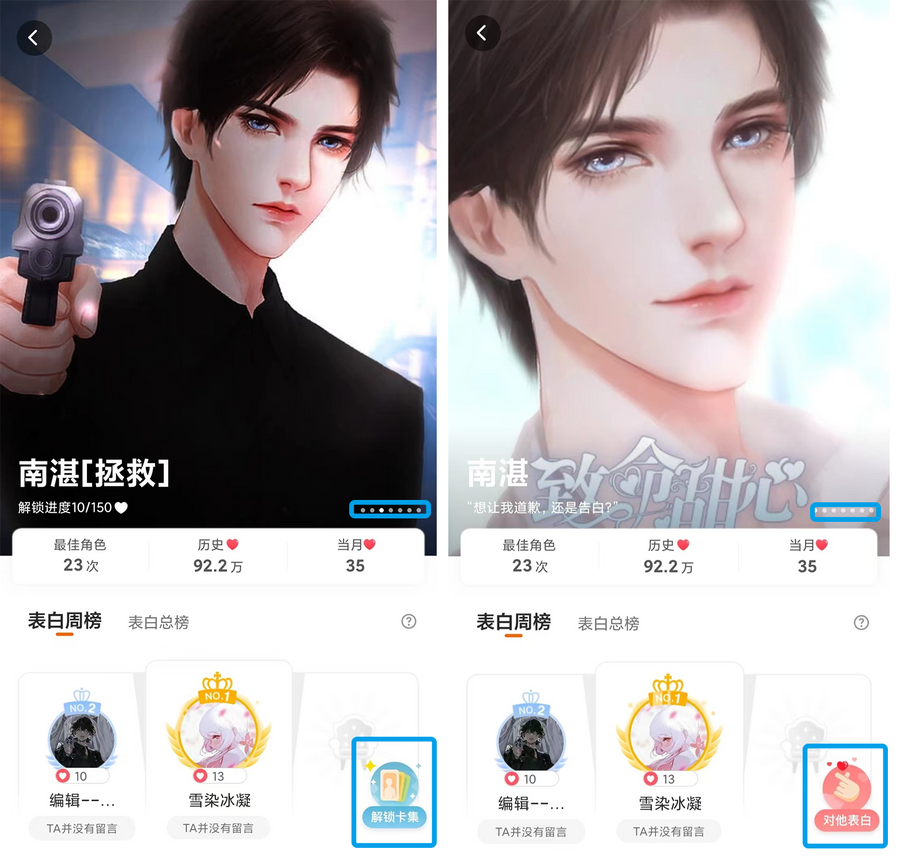 移动端进入拥有卡集标识的表白卡时,第一张为常规角色的表白卡,滑动则查看卡集内表白卡,并可解锁卡集内的表白卡。