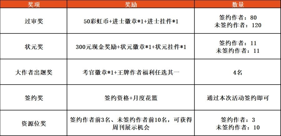 4. 过审奖与状元奖不叠加,每个作品最多可获得一个奖项,过审奖每个作者仅可获得一次。