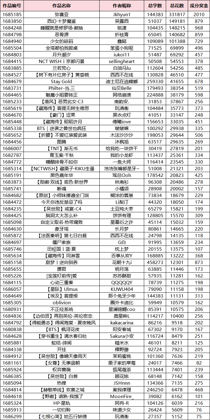 每阶段鲜花瓜分奖励可查看下方链接:
