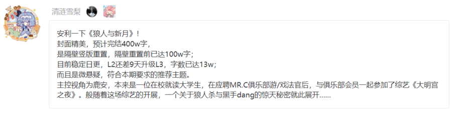 本作以《Mafia》所衍生的狼人意象游戯——国内《狼人杀》为主线展开剧情,以普通狼人游戯和轻松欢快的日常为主。