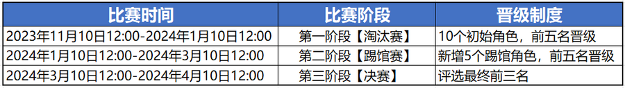 比赛分为三个阶段,每阶段根据觉醒值排名决定晋级名额,觉醒值每阶段累计,淘汰角色觉醒值将不再增长。
