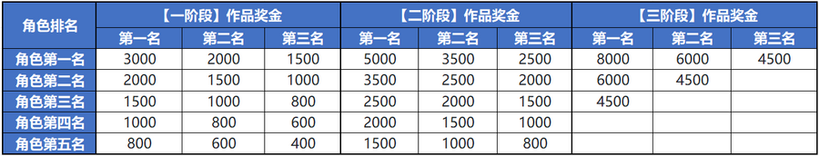 活动将依据绑定角色作品的“总觉醒值”对角色进行排名,每阶段晋级的角色名下“觉醒值贡献前三名的作品”可获得对应奖金,奖金详情如下: