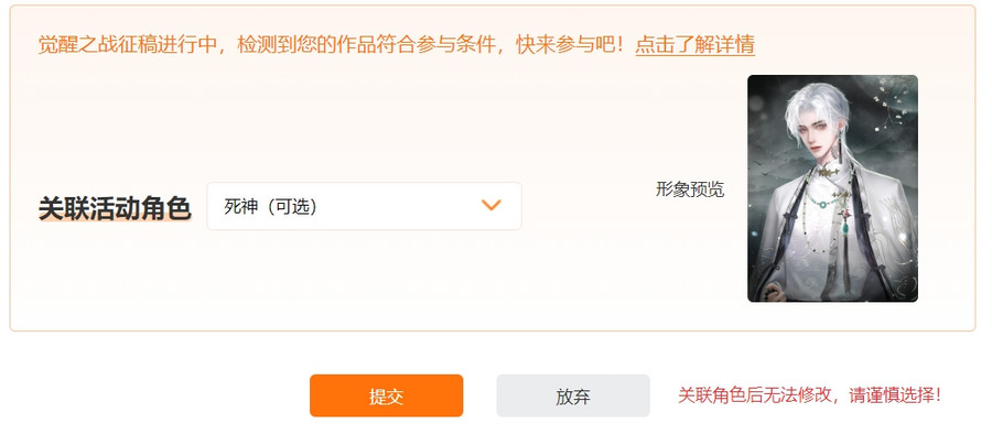*可在作者个人中心--作品管理--表白墙设置的地方创建参赛角色,创建页面下拉至底部关联活动角色即可。