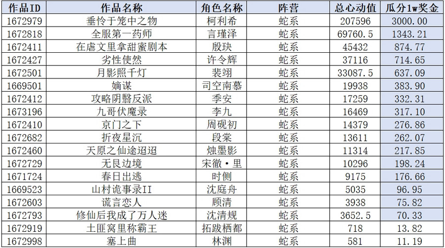 经过三个月的PK,截止8月22日24时,【鹰系】阵营总心动值462063.5,【蛇系】阵营总心动值519357.5,【蛇系】阵营获胜。本赛段的万元大奖瓜分机会属于【蛇系】阵营全部角色!