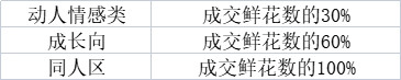 小橙用100鲜花参演了客串角色A,如作品是动人情感类,得100*30%=30野花;励志成长类,得100*60%=60野花;同人区,得100*100%=100野花。