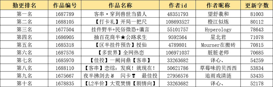 勤更奖励不分阵营,按更新字数总排名计算,最低要求阶段更新大于20000字(含首发);