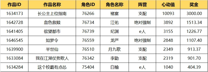 2、作品PK奖将随作品获奖当月分红发放50%,随作品完结的当月分红发放剩余50%。每部作品每赛段最高可领3000元PK奖金。如每阶段心动值过低,计算后作品奖金低于50元的将不进行发放。