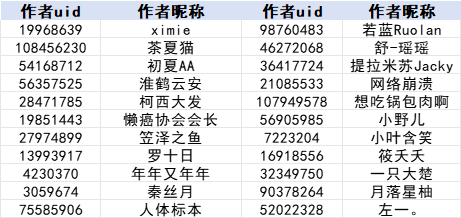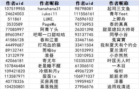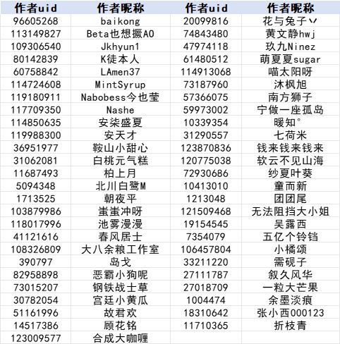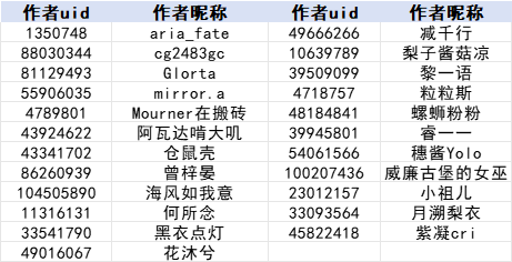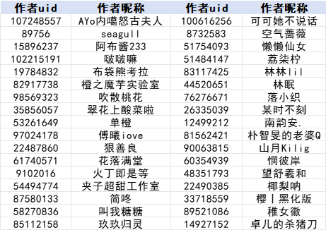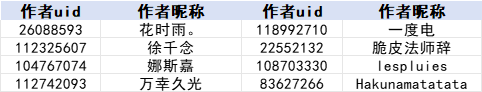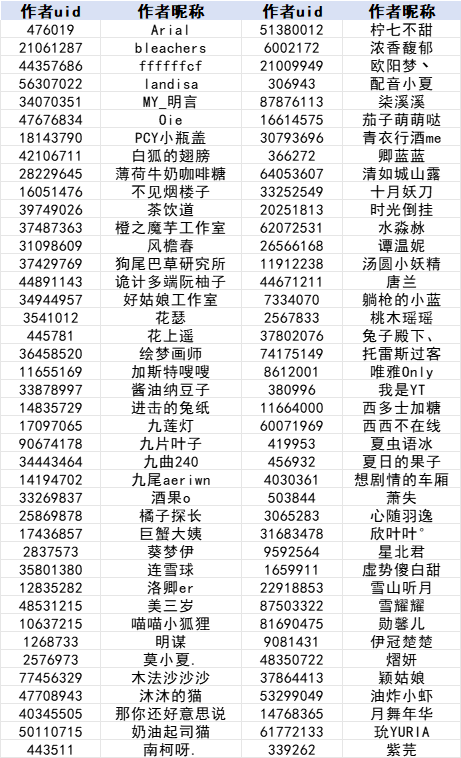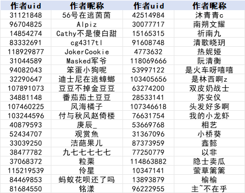 注:为方便作者查找,本名单按照作者昵称首字母升序排列