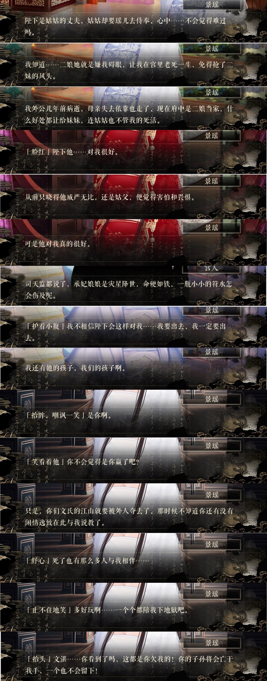 出身没落贵族的景瑶,曾经也是一个心思单纯的善良女子,因家族背弃被献给皇帝,原本以为将要在宫中老死一生,一次意外得到皇帝宠爱,以为盼来了幸福,谁料到好景不长被至亲诬陷为灾星,成为天灾人祸的背负者,失宠打入冷宫,险些一尸两命,身世浮沉命运不公令她产生滔天怨恨,她从冷宫中爬出来,只为报复二字,无恶不作,草菅人命,可说是导致北朝灭亡的罪魁祸首,虽不是正面角色,但也算是故事中最为出彩的配角之一,令读者又爱又恨。