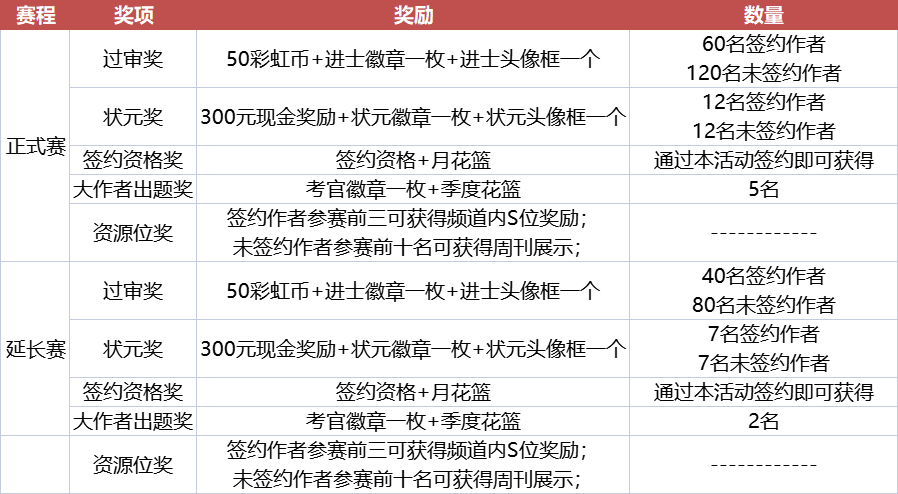 ①过审奖将在活动结束之后统一发放,一个ID对应一个作品,每个赛段每个ID仅发放一次;