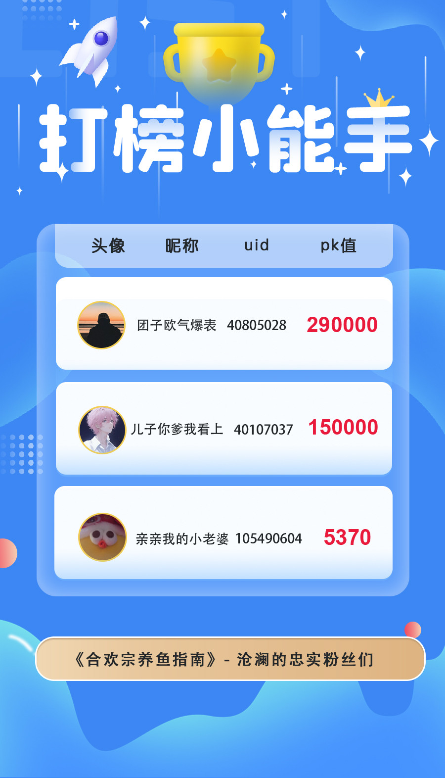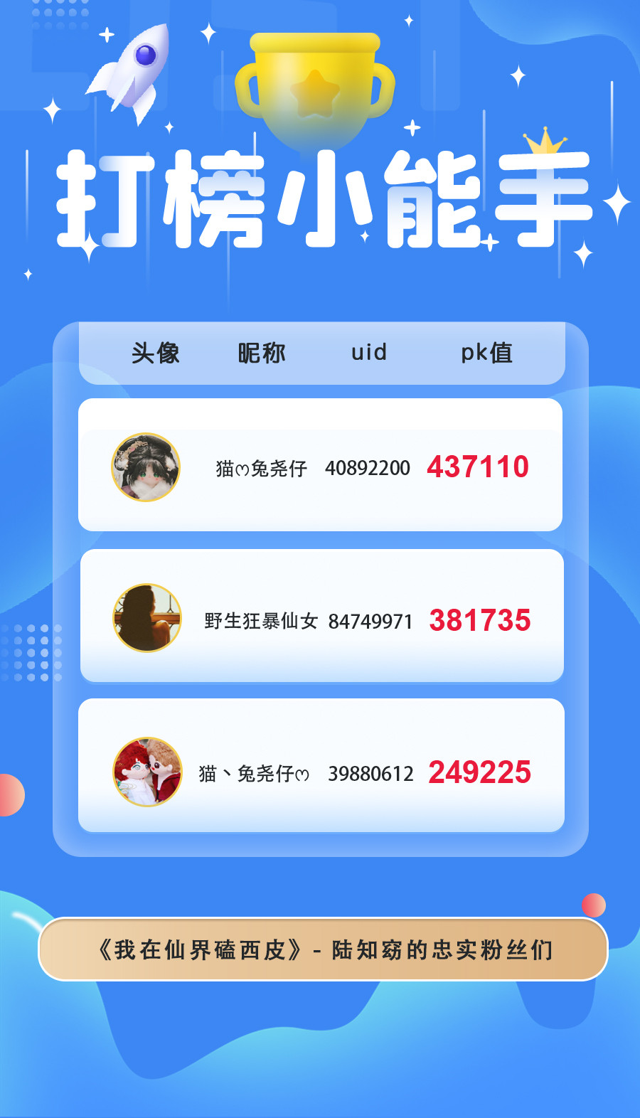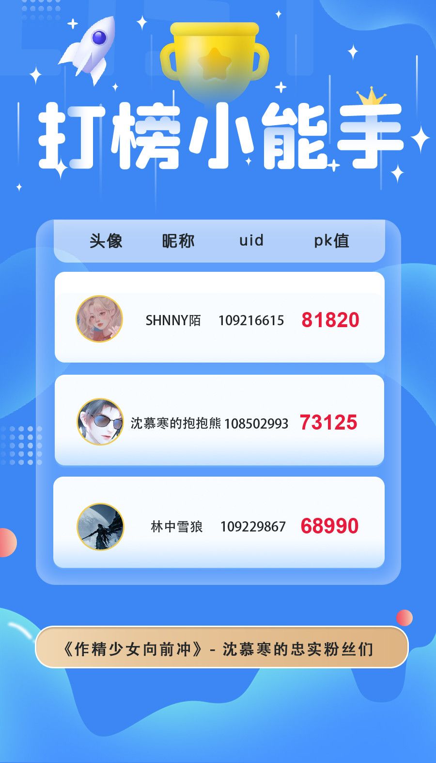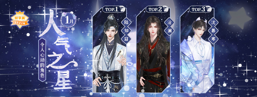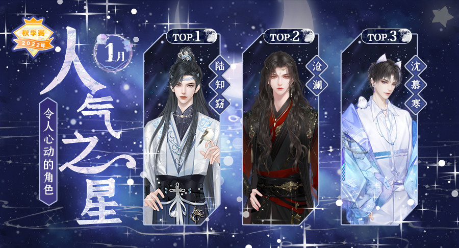 本月在大家的热情打投下胜出的是:陆知窈、沧澜、沈慕寒,恭喜他们啦!
