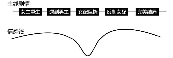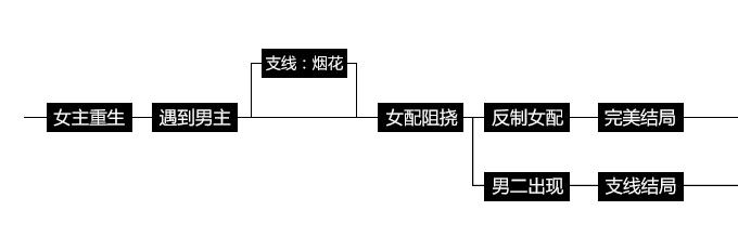 比如,我们简单设定这样一个故事,女主重生,遇到上一世没有在一起的男主,接着上一世害死她的女配又想故技重施,被女主反制,最后女主男主幸福的生活在一起。