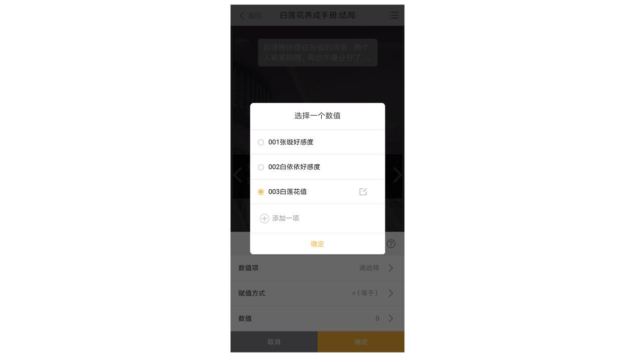 而想要看到这一段剧情,必须要同时满足多个条件才可以。比如,我们这里设置了三个数值,分别是男主“张璇好感度”、女配“白依依好感度”、和一个“白莲花值”。