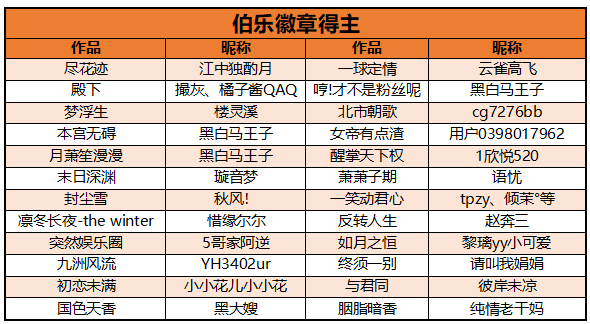 本刊为大家展现第一手“百里挑一”大赛战况,包括鲜花、人气、收藏增长快的上升榜、勤劳码字不拖更的勤更榜、以及上周新作榜和活动作品,好料多多,还有伯乐徽章可以拿哦!
