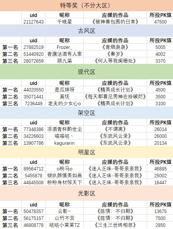 上期的“为你心中的唯一”应援打榜活动圆满结束啦~看的出来大家真的是十分努力呢!下面是上期“只为你应援”活动的获奖名单,来看看有没有你吧~同时也一起来看看你爱的作品有没有“出道”吧!