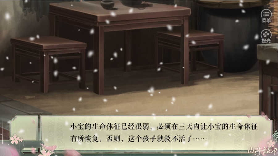 分析:通过两句环境描写和三四句女主和小孩子的对话,简单快速的交代了女主穿越后的身份和所处环境,在让玩家了解背景的同时,也激起了玩家的同情心理,为下面的危机事件铺垫好——婴儿的奄奄一息。给玩家一种紧迫感和挑战,同时也让玩家期待后面这个破败的家会如何在穿越女主的带领下步步走上富裕等等。