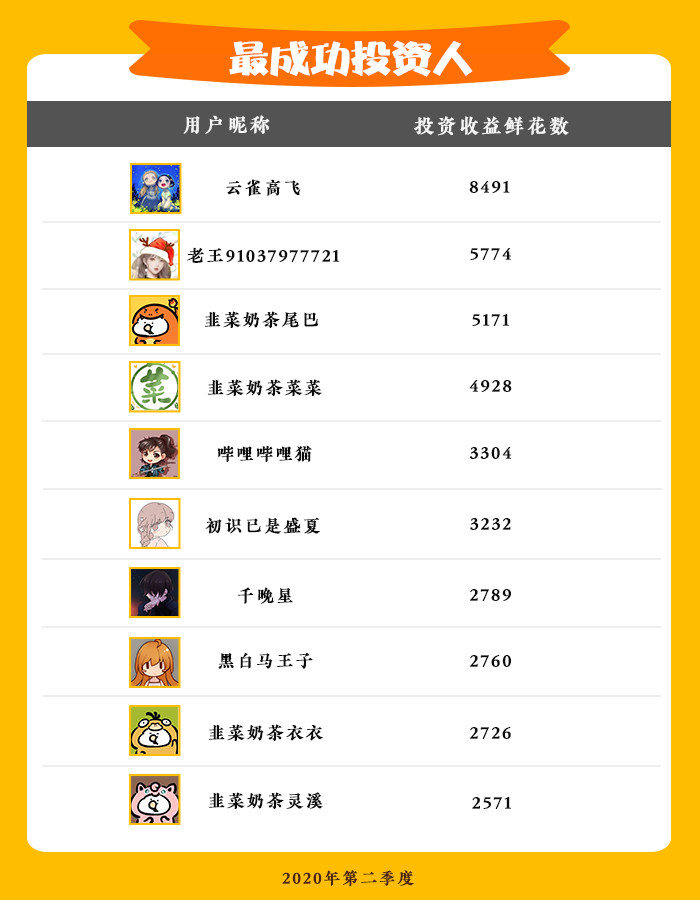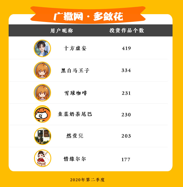 以下是2020年第二季度投资作品个数最多的投资人们,他们慧眼识珠,不放过任何一个佳作,因此盆满钵满~