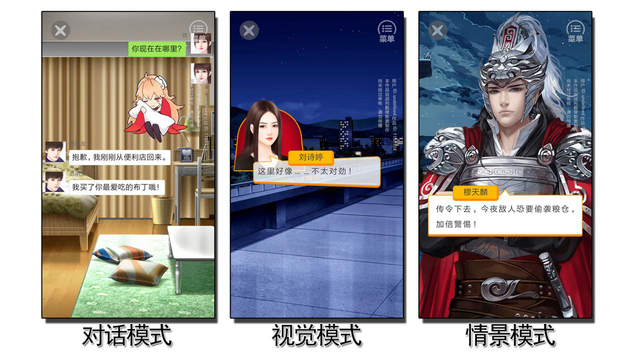 轻橙与其他工具最大的不同就是,它仅可以制作竖版的作品。即便如此,轻橙依然紧跟着潮流,拥有三种市面上常见的作品模式:对话模式、视觉模式、情景模式。三种模式拥有不同的体验,制作步骤却是基本相同。